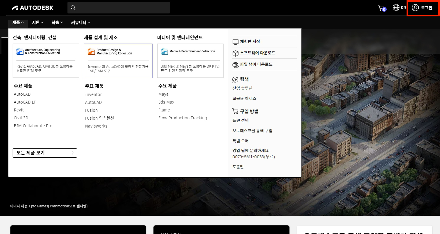 ① 오토데스크 홈페이지에 접속 후 오른쪽 상단의 [로그인]을 클릭합니다.