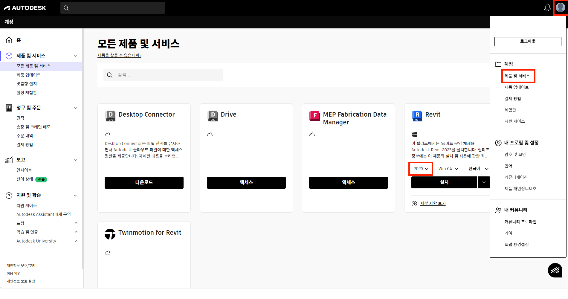 위와 같은 방법으로 체험기간 시작 후 우측 상단 [사람 아이콘] - [제품 및 서비스] 메뉴에서 년도를 [2023]으로 선택 후 설치합니다.