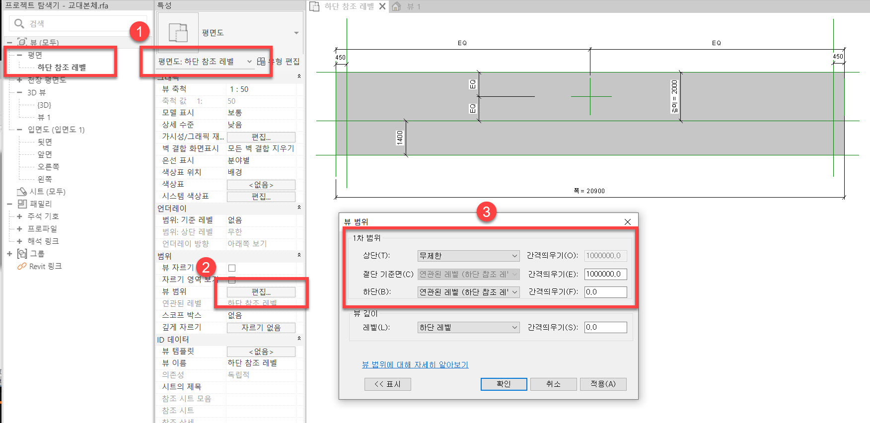 [하단 참조 레벨]의 뷰 범위 옵션에서 상단과 절단 기준면을 “무제한”으로 설정하거나, 최대한 큰 값을 입력해 보시기 바랍니다.