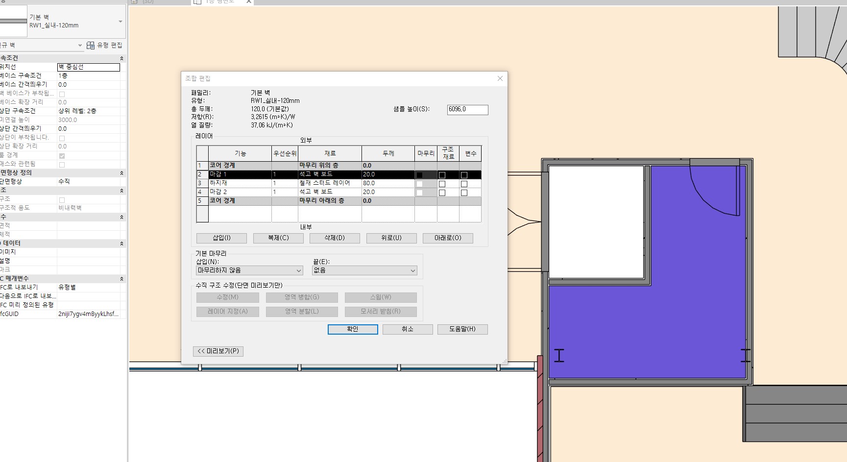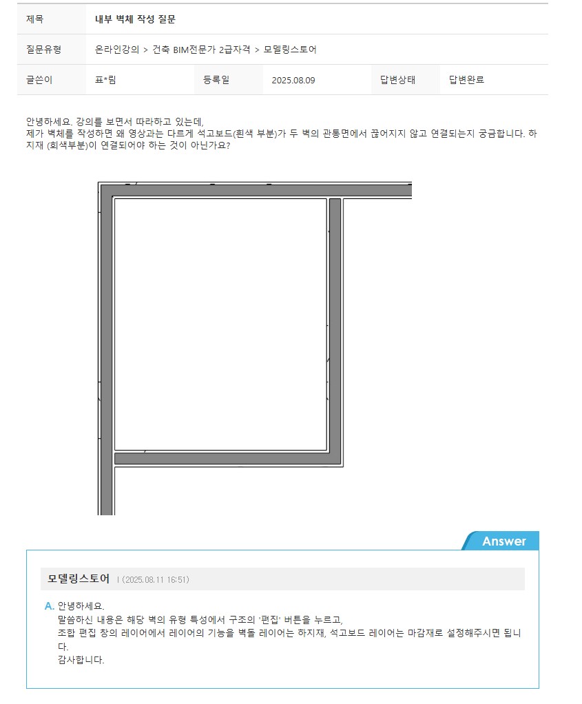 기능은 이미 하지재로 선택되어 있었는데 (문제 조건이 벽돌이 아니라 철재 스터드이기는 합니다) 영상에서처럼 하지재 부분끼리 연결되지는 않네요.
