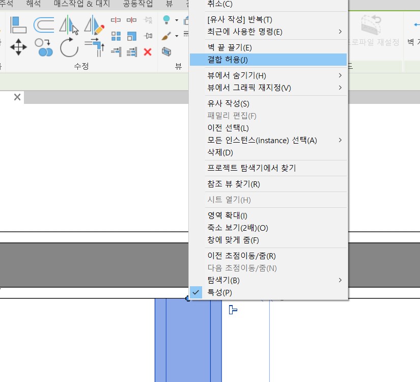 아래 그림과 같이 벽체를 선택하고 끝점을 우클릭하여 결합 허용이 되어 있는지 확인해주세요.