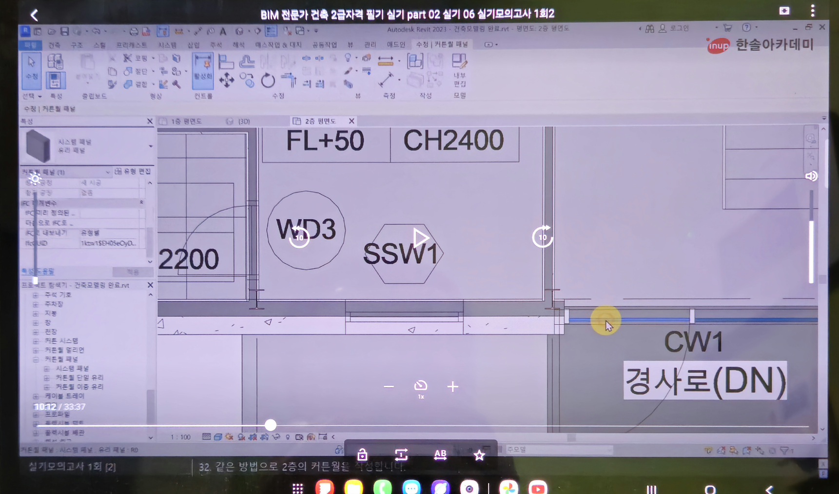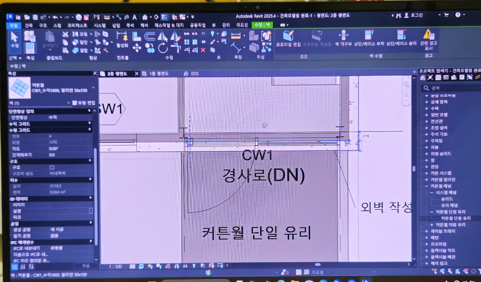 그림처럼 경사로의 CW1의 시스템 패널-유리패널이 선택이 안됩니다. 커튼월CW1 또는 벽체만 선택됩니다. 동영상대로 똑같이 따라 했습니다. 솔루션을 주세요