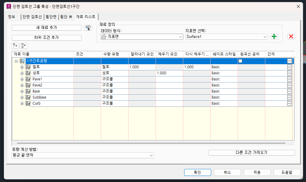 재료 구분은 미리 설정된 재료 데이터가 있으면 추가할 수 있습니다. 단면검토선 - 재료리스트 설정 메뉴에서 [다른 조건 가져오기] 기능을 통해, 미리 설정된 재료계산 스타일을 불러와 적용할 수 있습니다.