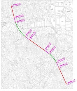 이는 선형 스타일 설정에서 원곡선을 초록색, 완화곡선을 분홍색으로 지정했기 때문입니다.