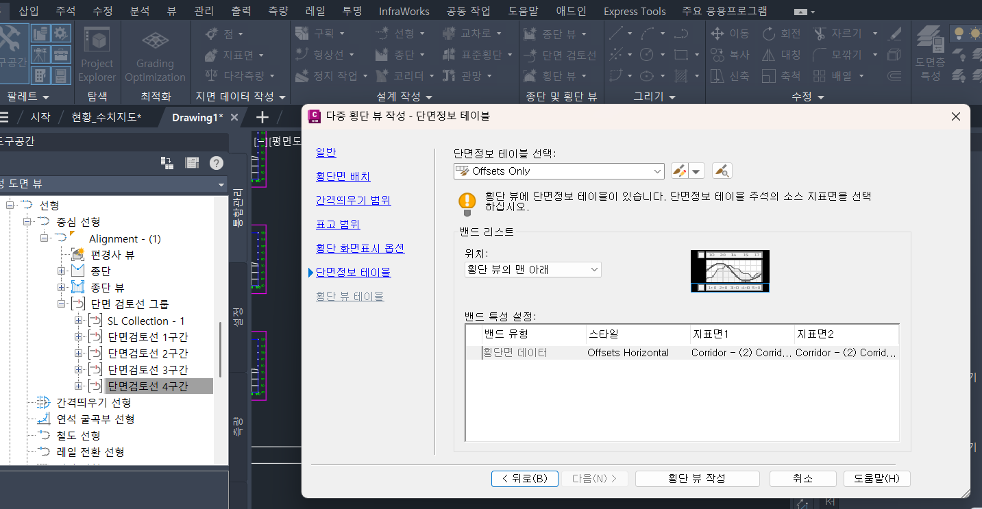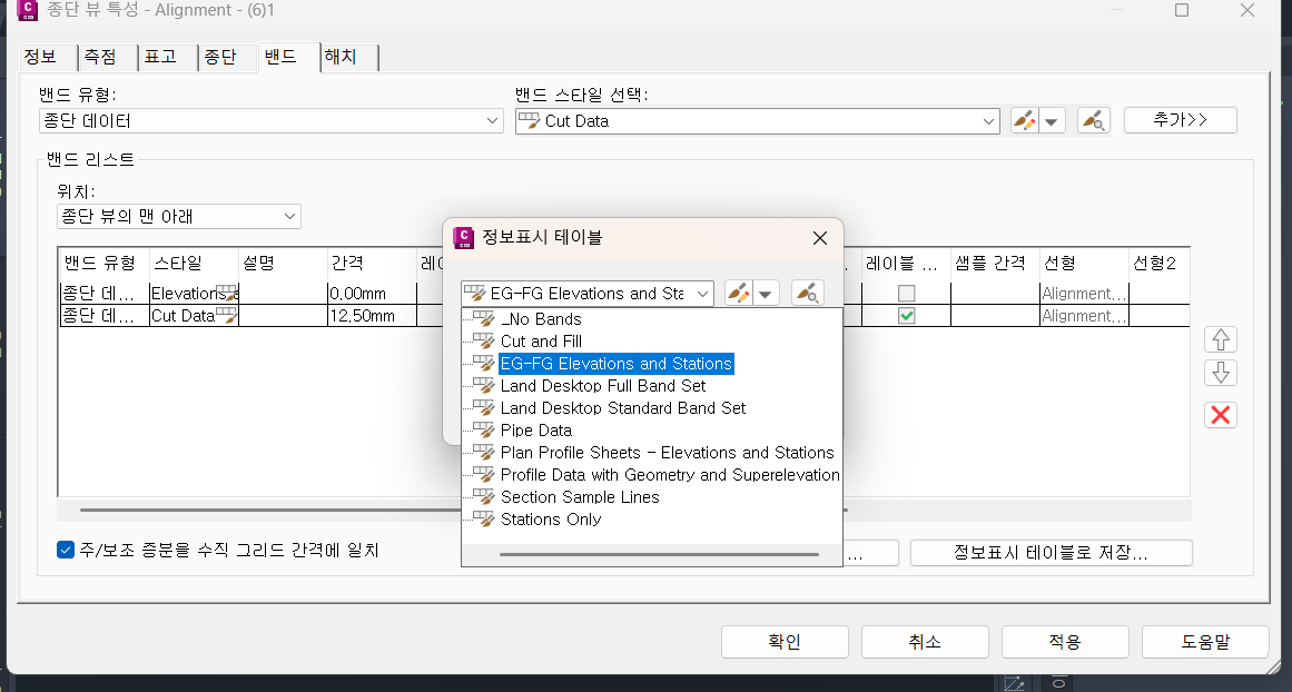 1. 수치지도 3d변환 후 선형작성하고 종단뷰에서 종단 데이터 추가할 때 밴드 스타일이 보이지 않습니다. 원래의 예제파일로 풀 때는 인강에서 말씀하신 밴드 테이블이 뜨는데, 수치지도로 풀 때는 보이지 않습니다. 그래서 시험에서는 밴드스타일이 인강에서처럼 목록에 뜨는 것인지 궁금합니다.