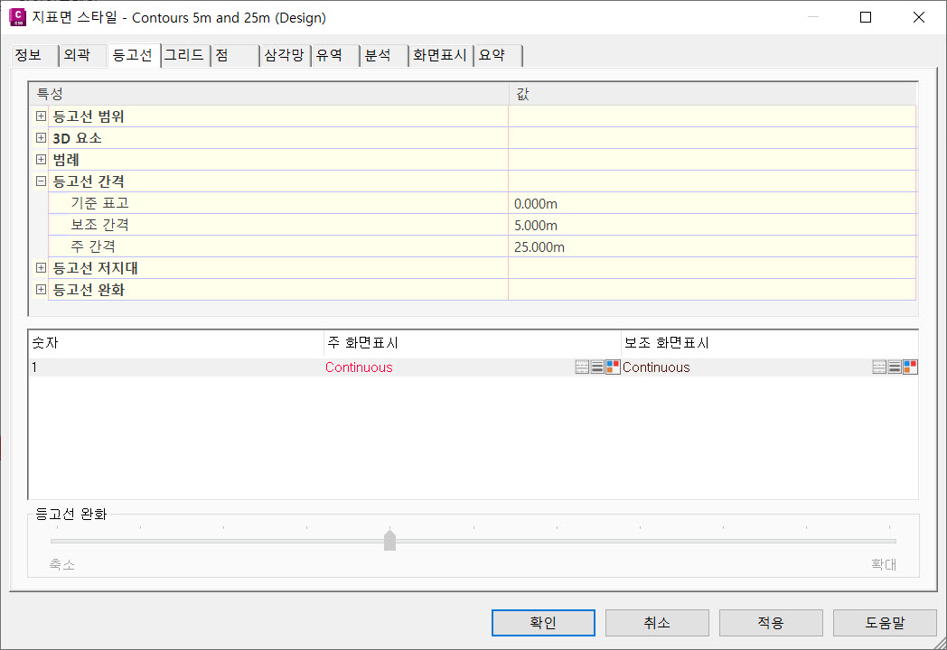 즉 Civil3D가 자동으로 주등고선과 보조등고선을 구분하여 인식하는 것은 아닙니다.
