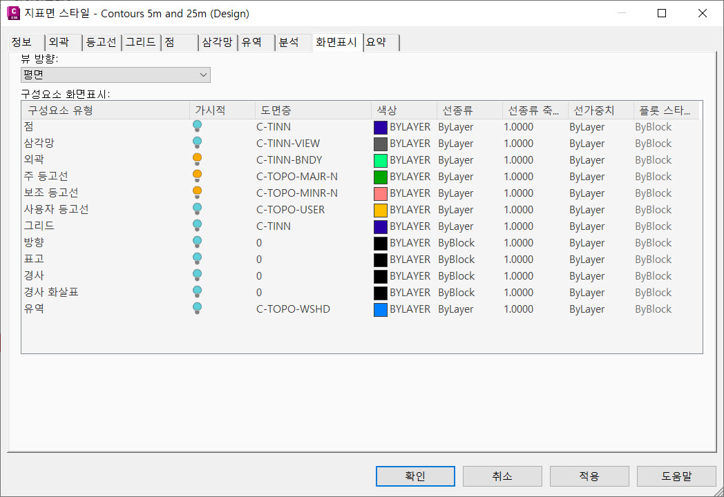 이렇게 생성된 Civil3D 삼각망(TIN) 지표면은 스타일을 조정하여 등고선 간격, 색상 등을 조정하여 사용하게 됩니다.