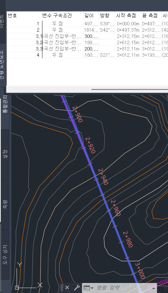 제가 작성한 선형 구간은 0-3+012.11까지 인데, 추가 공개문제 1번에서의 선형 구간은 2790까지 입니다. 처음에 선형 작성시 그 길이를 대충 추정하면서 PI점 찍어 작성하지만, 항상 문제에서 제시하는 값과 일치하게 작성하기 어렵다고 생각합니다.
