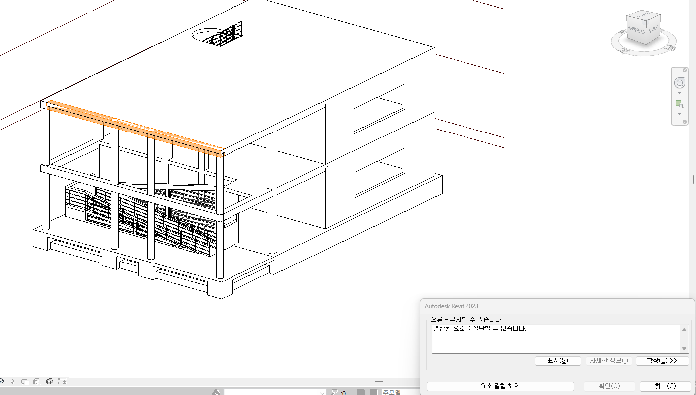 벽체와 보 간섭에서 벽체는 형상 결합을 통해서 해결하였으나, 보 간섭은 결합된 요소를 절단할수 없다는 알림창이 뜹니다