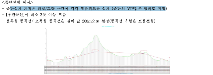 일반적으로 도로 설계에서 교량과 터널 구간을 설계하는 기준은, 주로 도로의 지형, 지질 조건, 구조물의 기능적 요구사항 등 다양한 요인을 고려하여 결정됩니다. 위와 같은 내용을 모두 반영할 수 없지만, 공개문제 시험내에서는 작업자가 임의로 이러한 조건들을 가상으로 고려하며 설계를 진행한다고 가정하시면 됩니다.