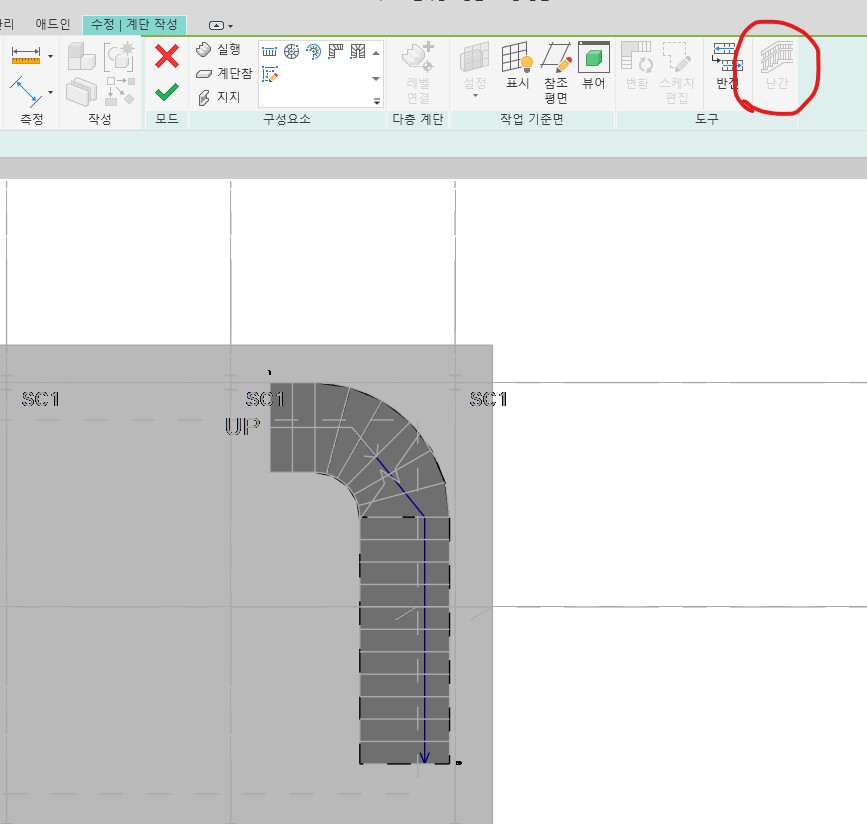 난간 없이 계단 작성을 완료한 후에 메뉴에서 건축 탭의 난간을 확장하여 계단/램프에 배치를 클릭하고, 뷰에서 계단을 선택하여 작성해주세요.