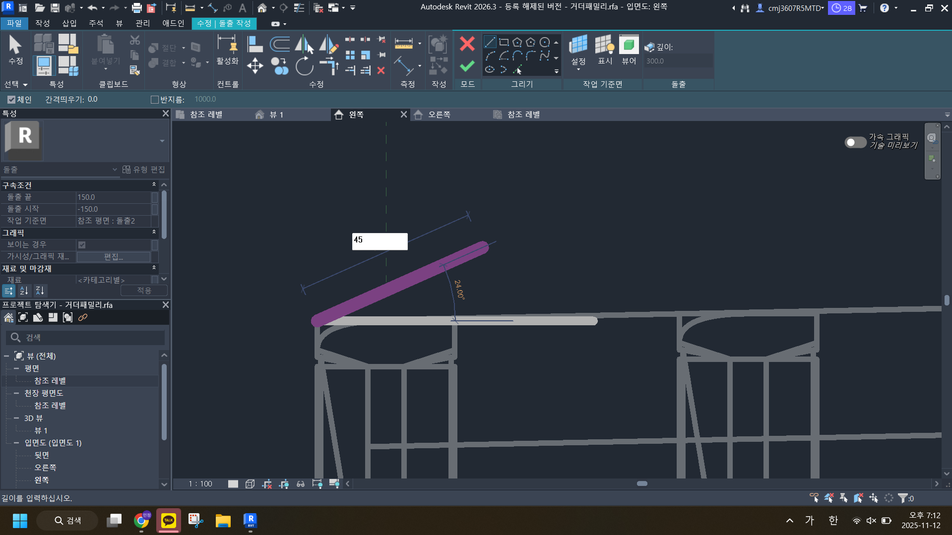 1-3. Revit에서 돌출로 선을 스케치할 경우 숫자를 입력하면 원하는 길이로만 적을 수 있는데 교재 속 그림처럼 45도를 바로 적으려면 어떻게 해야하나요?