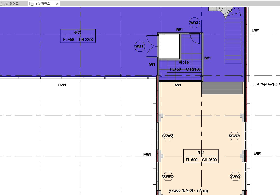첨부한 파일을 보시면 주방 FL+50/CH2250, 거실 FL-600/CH 2600으로 되어있습니다