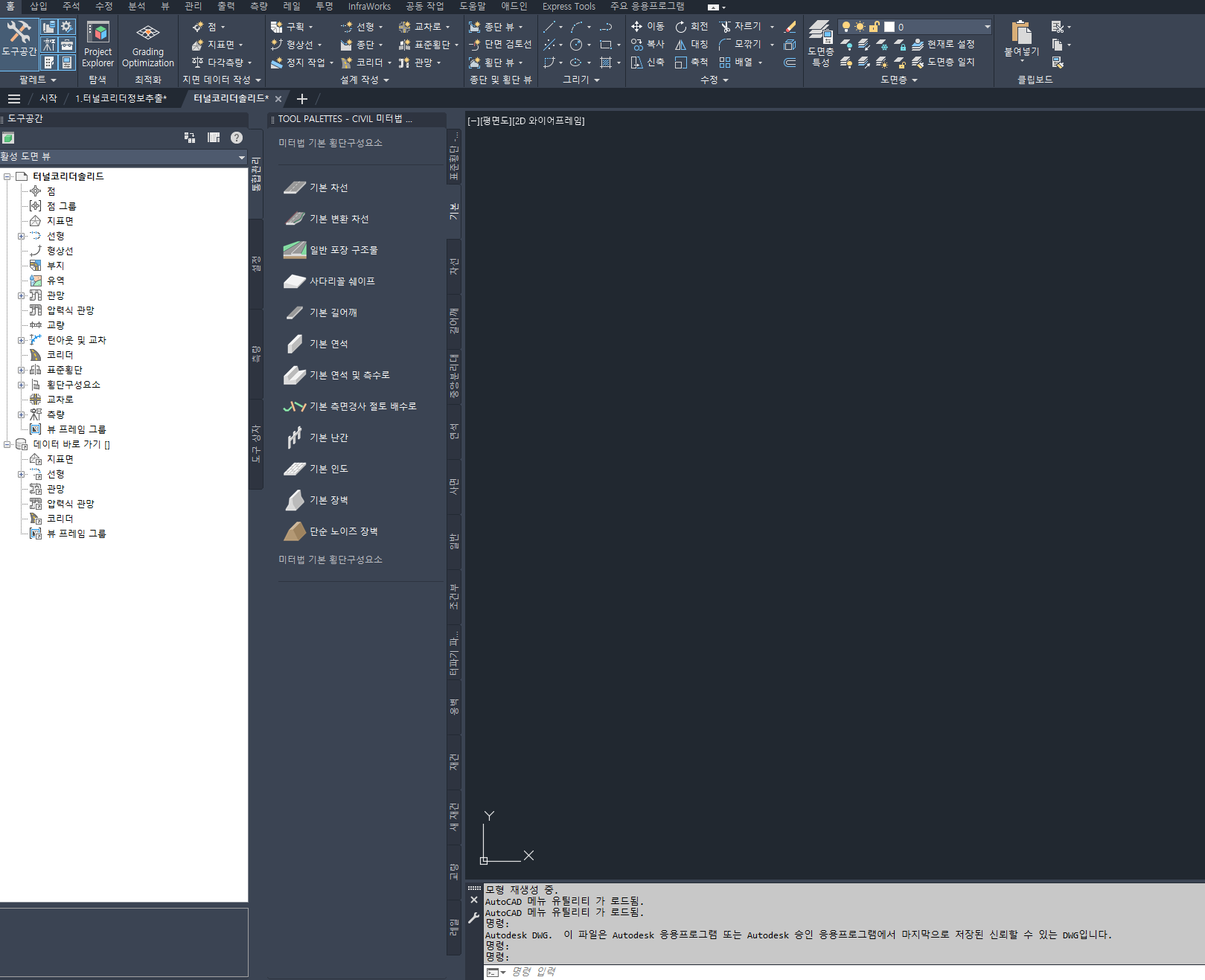 여기서, 저장된 해당 솔리드를 CIVIL 3D를 통해 열어보려고 하는데, 첨부된 화면처럼 아무것도 보이지가 않습니다. 어떤 문제인지 알 수 있을까요?