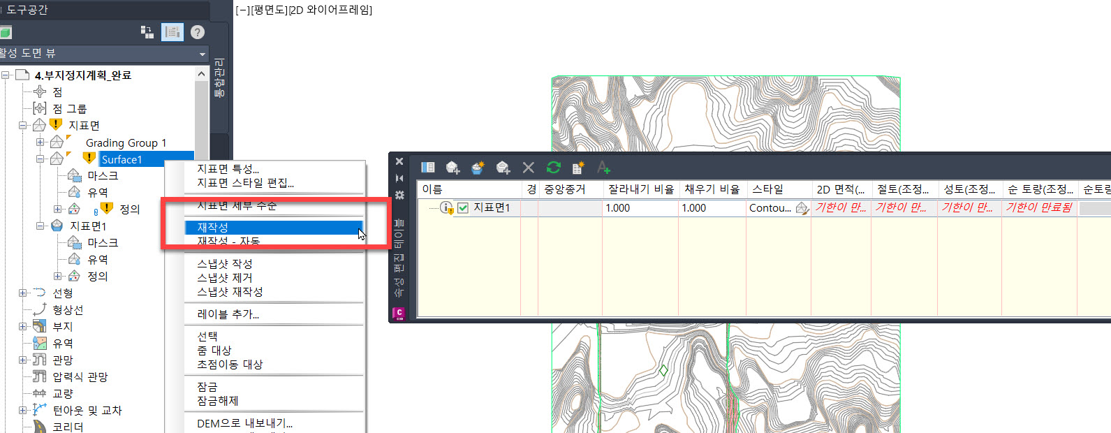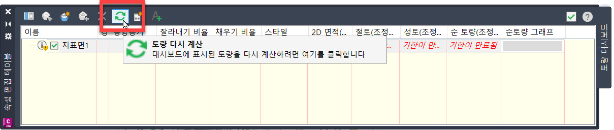 또는 "토량 다시 계산" 기능으로 모든 지표면을 자동으로 재작성할 수 있습니다.