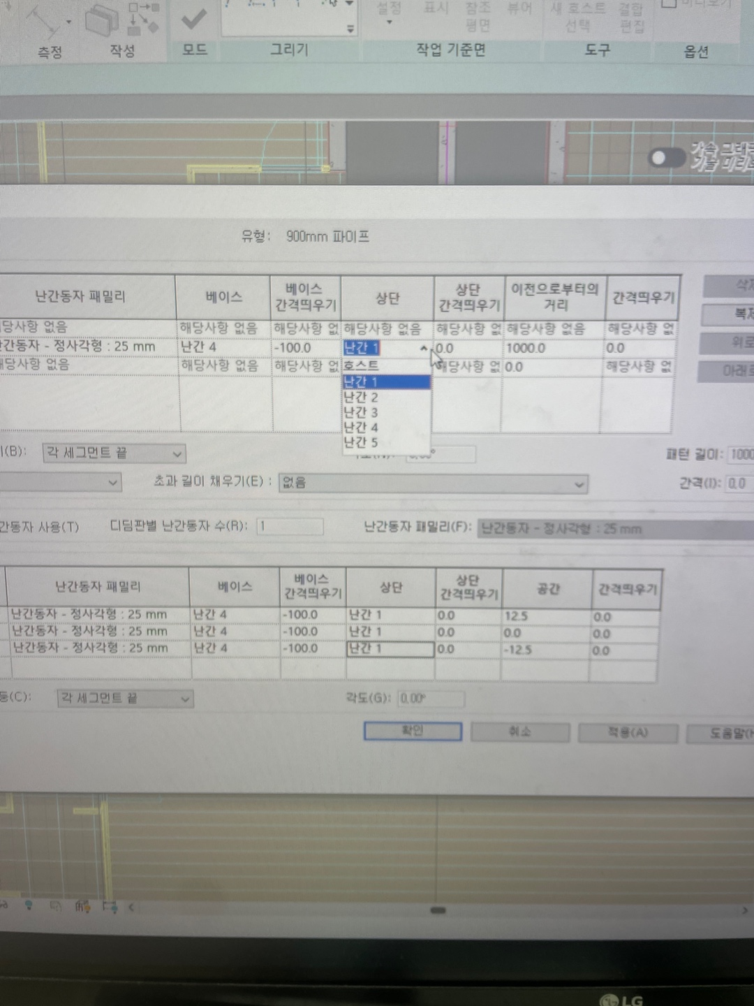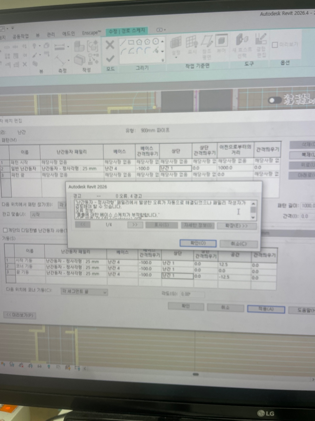 22강 경사로 및 난간 모델링을 보고 작업하였는데, 교제 p215 22번 난간동자 배치편집에서 상단 난간이 나오지 않고, 수정을 누르면 이상한 오류가 뜨고 난간수정이 되지 않습니다.