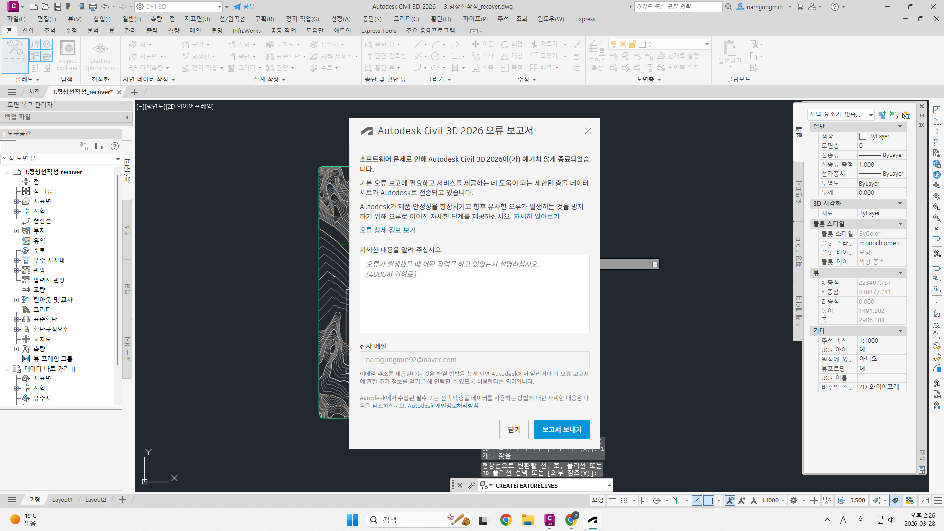 Civil 3D 2026 버전에서 객체를 이용한 형상선 작성시 발생하는 버그로 보입니다.